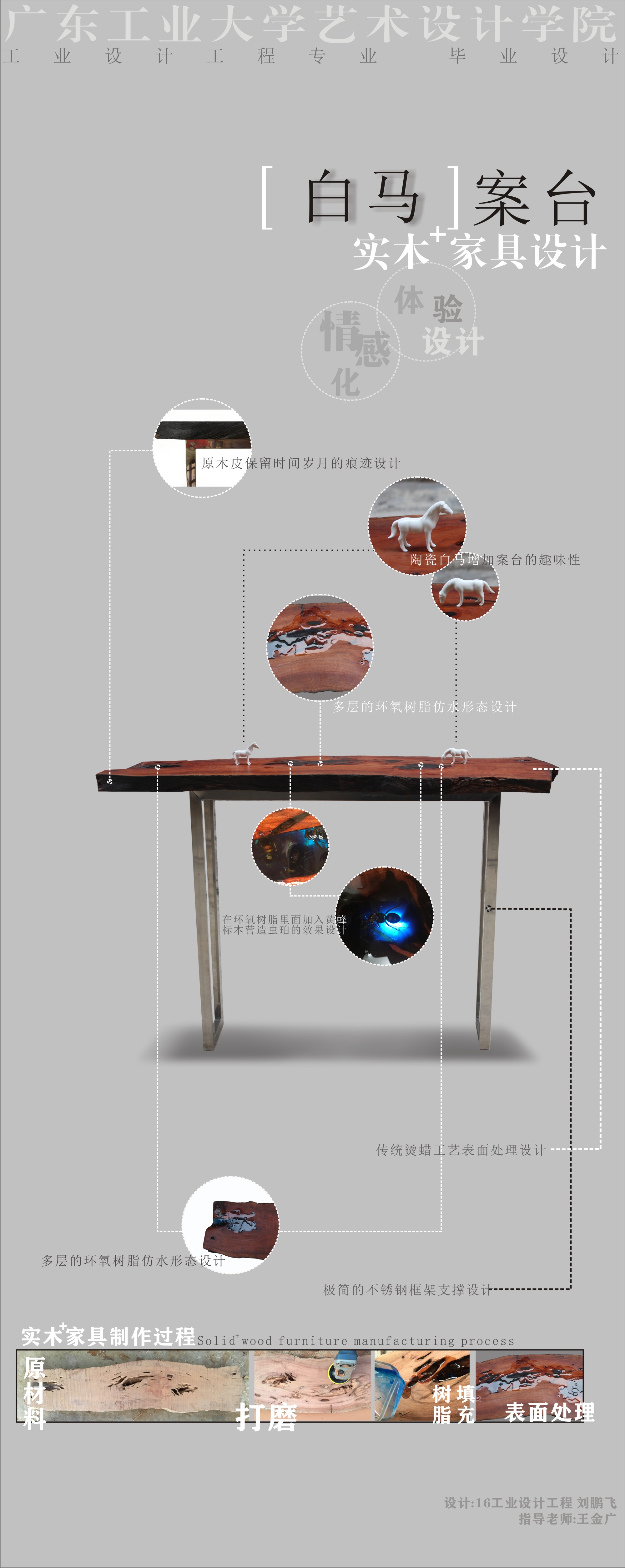 本设计方案是《情感化体验设计在实木+家具创新研究》论文课题的时实践设计。白马案台实木+家具设计是运用情感化体验设计理论对实木+家具做出创新性的实践设计。此作品利用廉价的、有问题、有孔洞的龙眼木材与不锈钢材料进行设计创作。为了使实木+家具更具创新情感,板材料加入了环氧树脂与黄蜂标本使家具作品变成了一个可以观察的虫珀场景。案台的表面还创新设计了浮于表面的多层仿水环氧树脂形态,并增加了两匹陶瓷白马,使案台成为了一个如马饮水的趣味场景,也是此家具超脱了普通家具设计具有的观赏性。得到更多消费者的青睐。