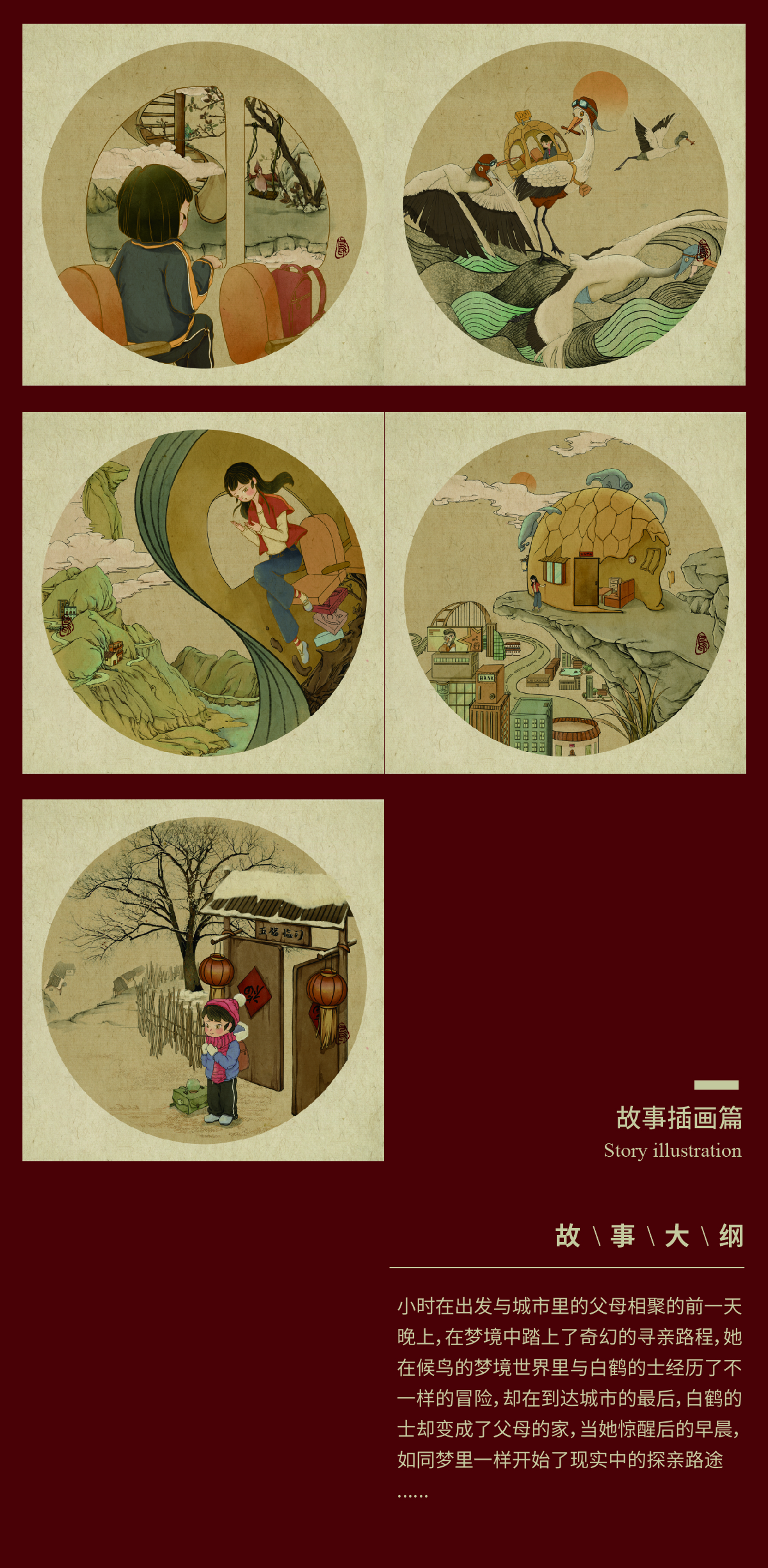 随着过去的几十年里中国城市化的发展逐渐加快,也经历着大规模的人口流动,大量的农民外出务工,为经济发展做出了贡献,但许多的他们也牺牲了切身的亲子时光。而“候鸟儿童”,作为流动儿童和留守儿童群体中特殊的一部分,“小候鸟”们也因特殊的经历而在生活与教育上展现不同的个性特点。此次的故事插画毕业设计创设了名为“小时”的主角梦境之旅,隐喻“候鸟儿童”的心理状态与渴望。所以,本设计依托“候鸟儿童”的现状,希望通过故事插画设计及宣传,呼唤社会能够给予“小时”这样的候鸟儿童群体更多的关爱。