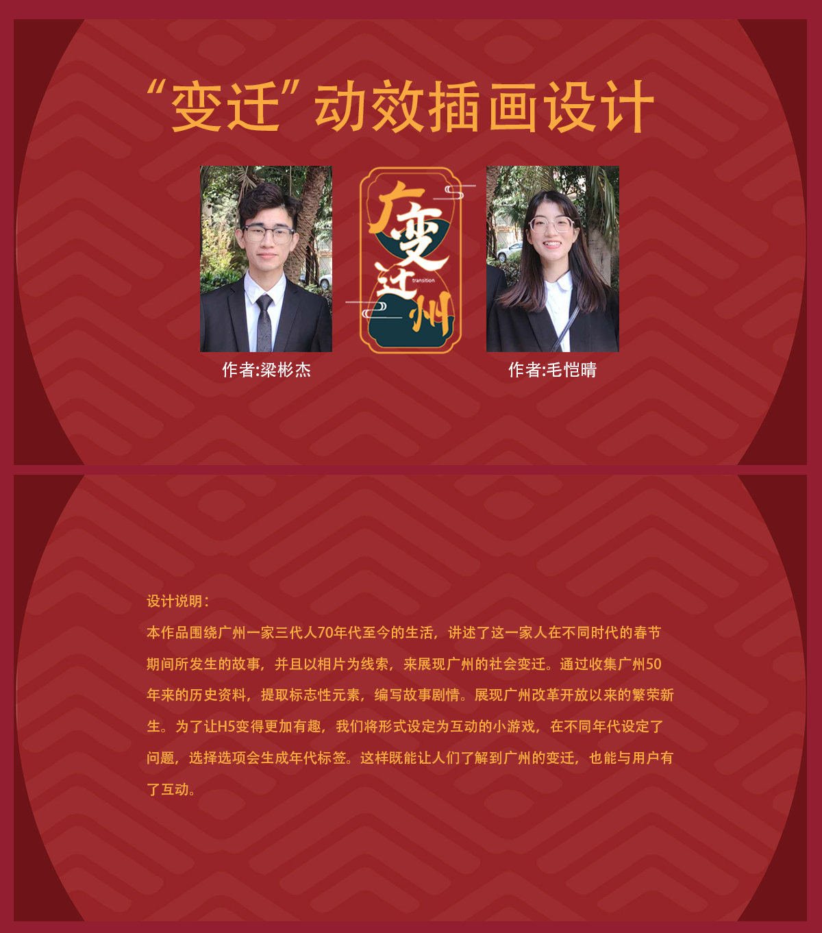 本作品围绕广州一家三代人70年代至今的生活,讲述了这一家人在不同时代的春节期间所发生的故事,并且以相片为线索,来展现广州的社会变迁。通过收集广州50年来的历史资料,提取标志性元素,编写故事剧情。展现广州改革开放以来的繁荣新生。为了让H5变得更加有趣,我们将形式设定为互动的小游戏,在不同年代设定了问题,选择选项,会生成年代标签。这样既能让人们了解到广州的变迁,也能与用户有了互动。
