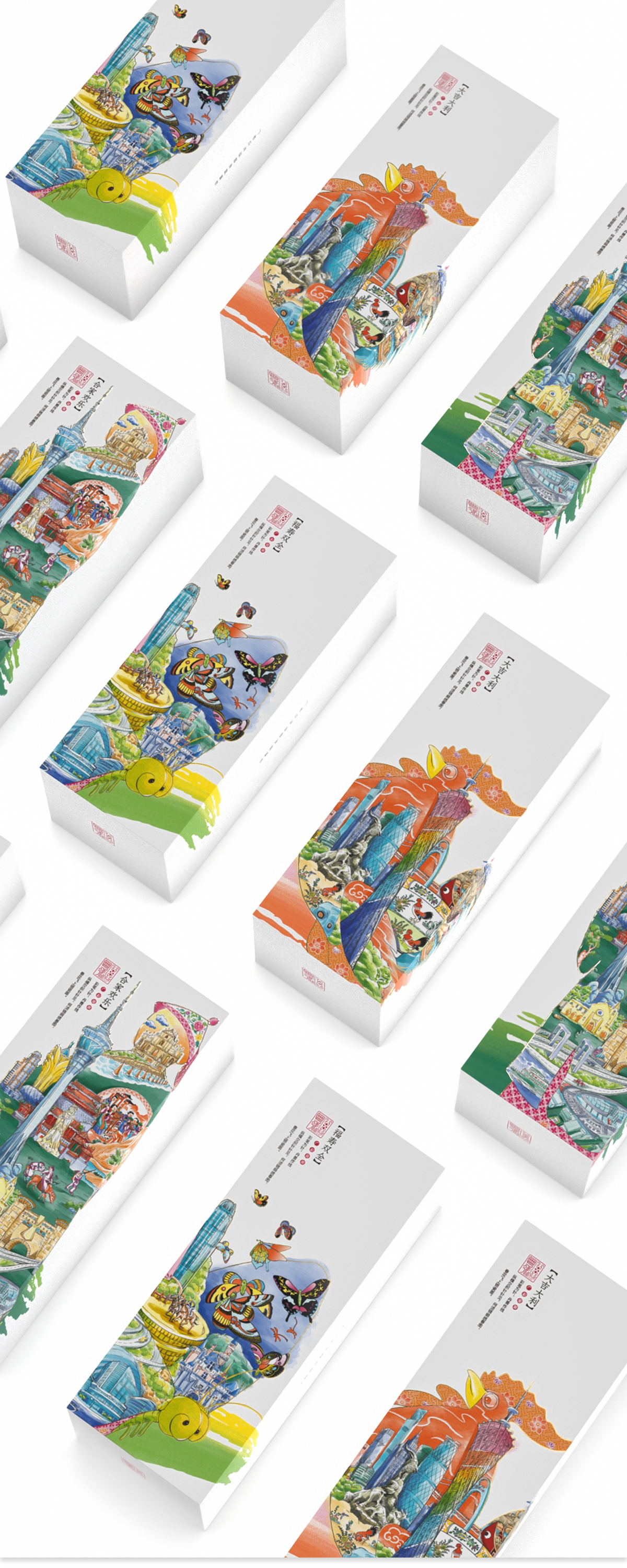 广彩是广州地区的釉上彩瓷,以构图繁密、色彩艳丽、金碧辉煌为特色,公鸡、蝴蝶、人物纹是广彩中的经典纹样。本设计拟定“粤今彩”广彩文化品牌,将广彩传统元素与现代设计相结合。设计作品选取广彩中的公鸡、蝴蝶、人物纹作为图形元素与粤港澳三座城市的文化、交通、建筑等元素相结合。通过设计出一系列插画、辅助图形、品牌标志进行应用,线上线下结合以达到推广目的。