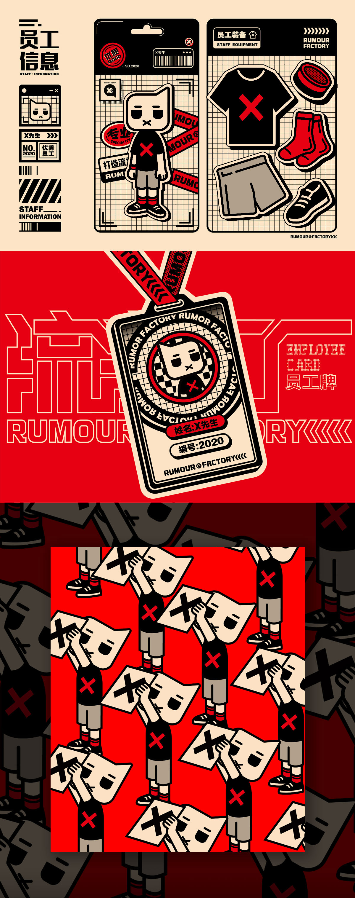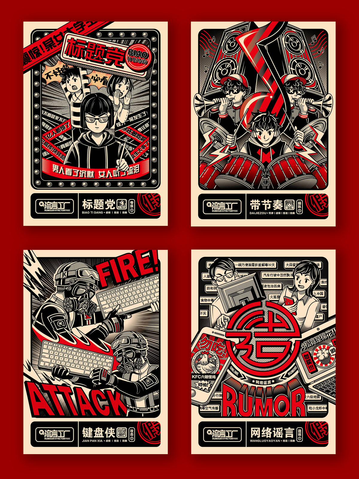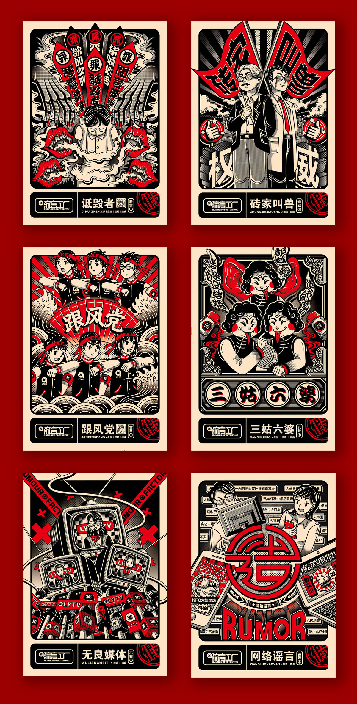 《流言工厂》是以流言为题材进行创作的主题系列设计,新媒体时代的到来,流言的传播渠道也变得越来越广,信息也越发缭乱,它给舆论环境造成很大的负面影响。对于这种现状,我想通过设立“流言工厂”这一主题来反映当今社会上的流言现象,并引发观众对于流言负面存在的思考。在本次毕业设计创作中,包含有插画、海报、动画视频等内容,插画主要描绘了九类流言制造者的形象,而海报则通过以图为主的方式来向大众传达有关于流言的相关资料,动画视频以简短的剧情来展现流言工厂的存在,通过以上几类设计内容来构造《流言工厂》的整体。