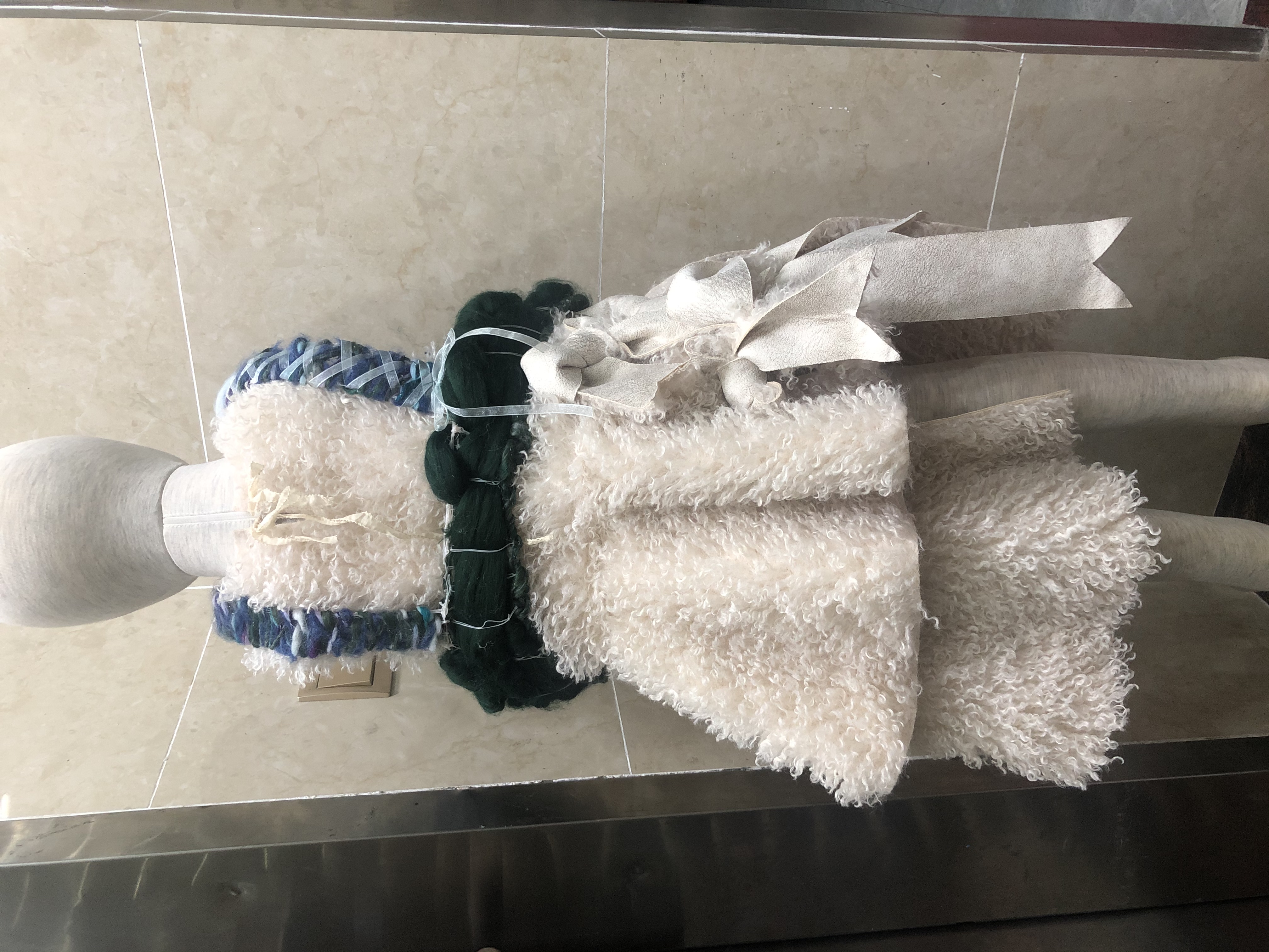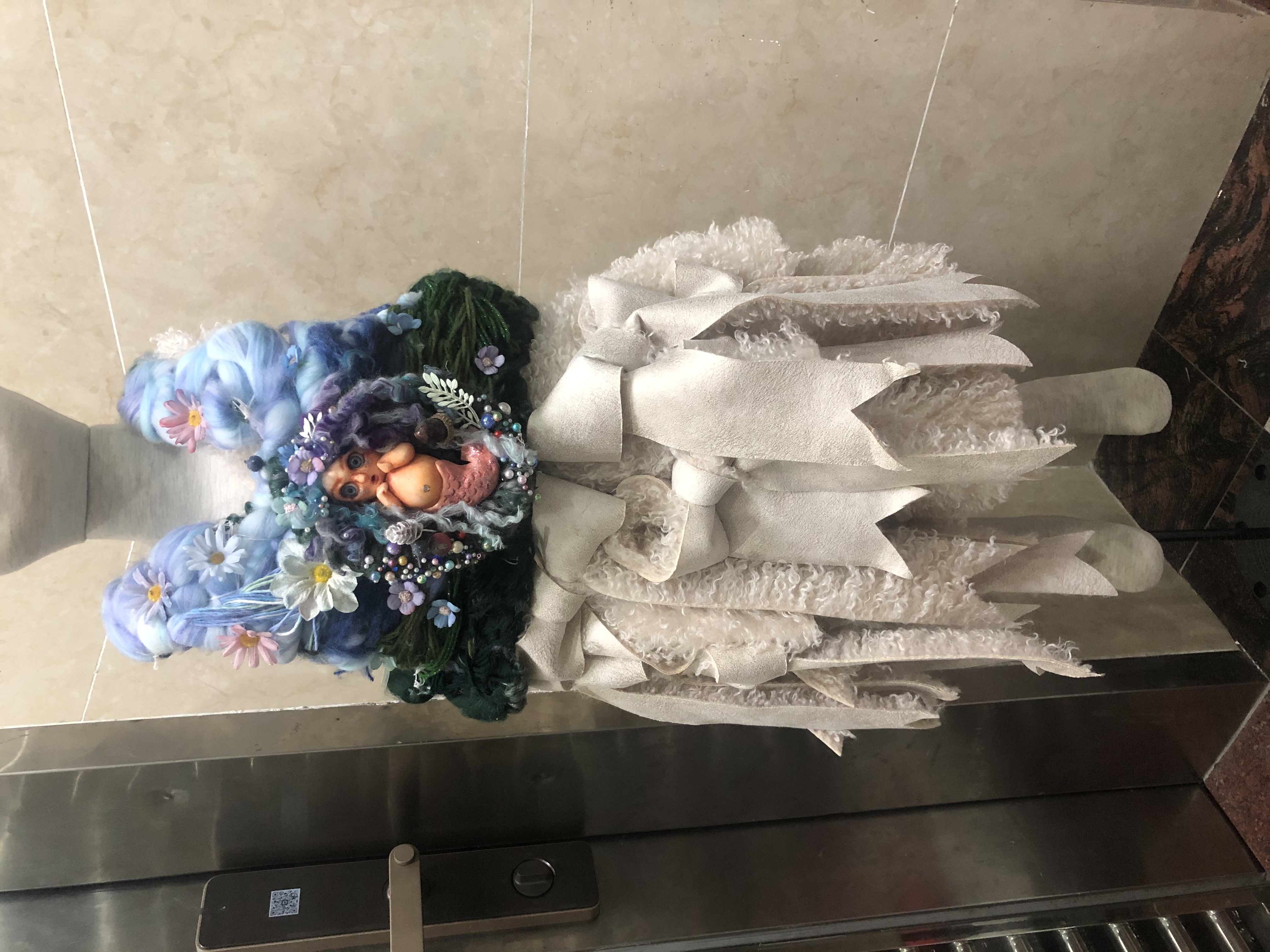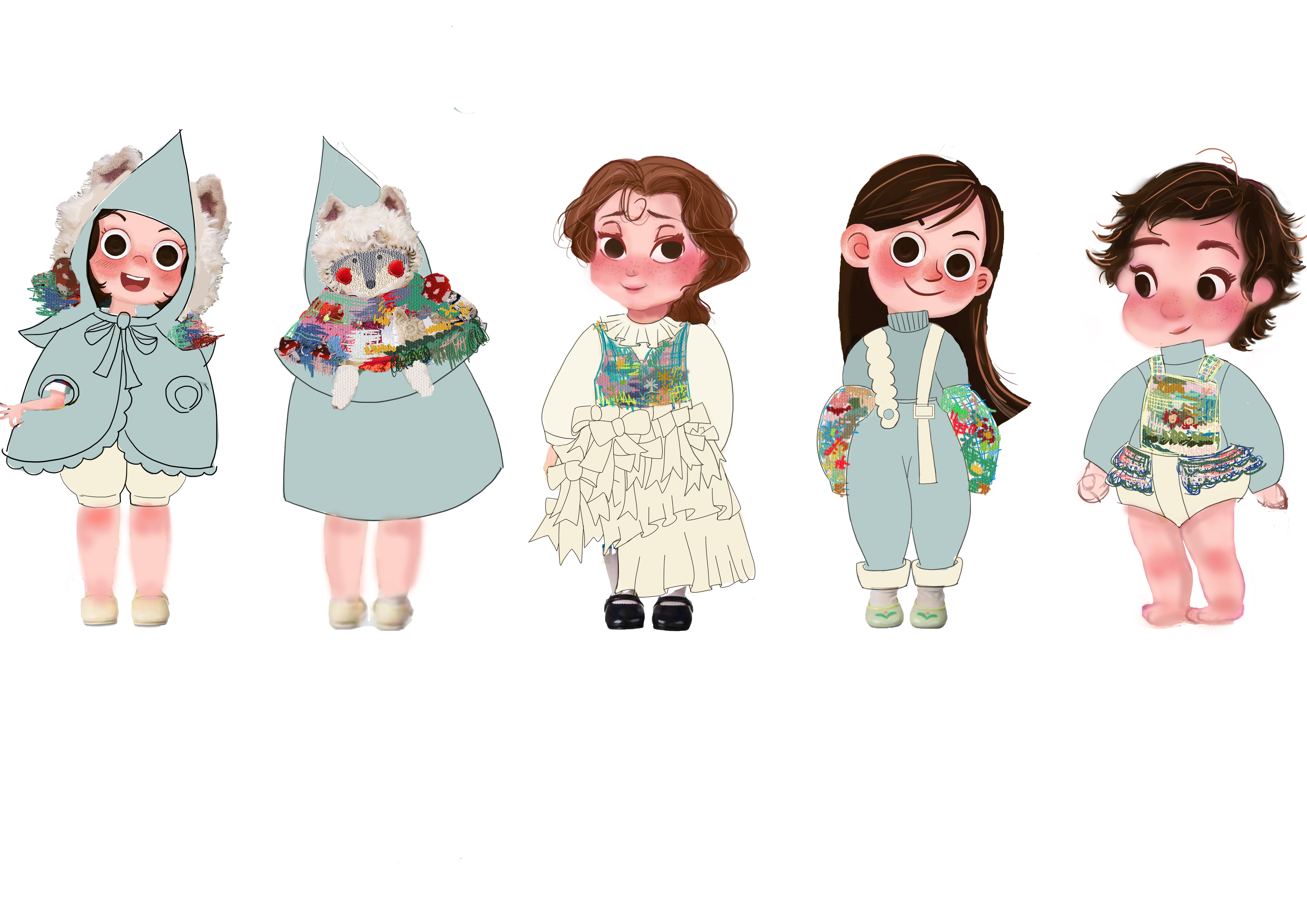 灵感来源于安徒生童话,将小时候睡前故事书最喜爱的卡通人物角色当作参考物开启的一部梦幻童话,本系列名为超龄儿童,服装主要表现在肌理上,主要使用3D打印笔制作框架,然后在框架上穿插毛线,选取与服装整体相匹配的毛线以及装饰物,制作出不同图案的肌理,形成独特的风格以及表现童趣。
