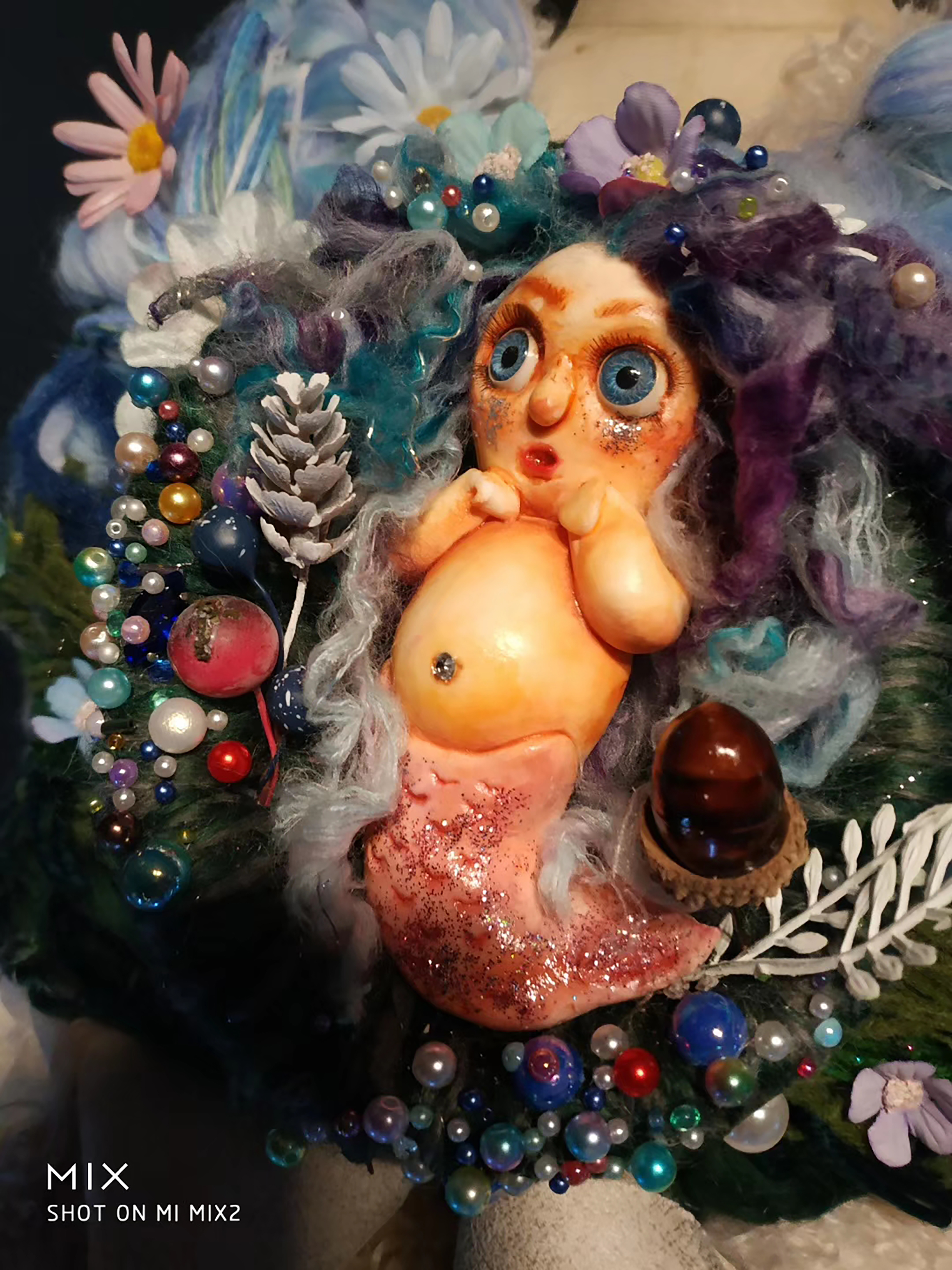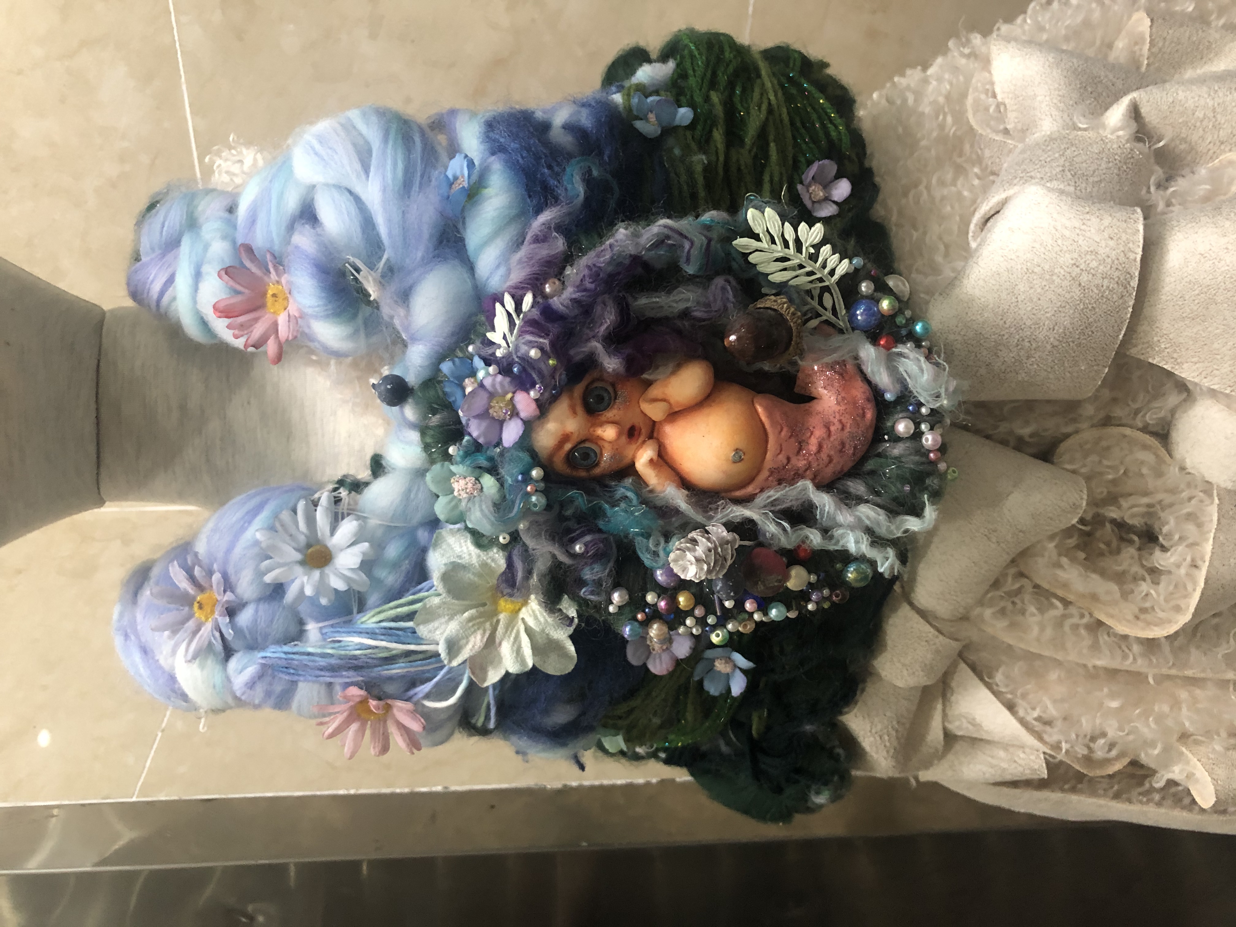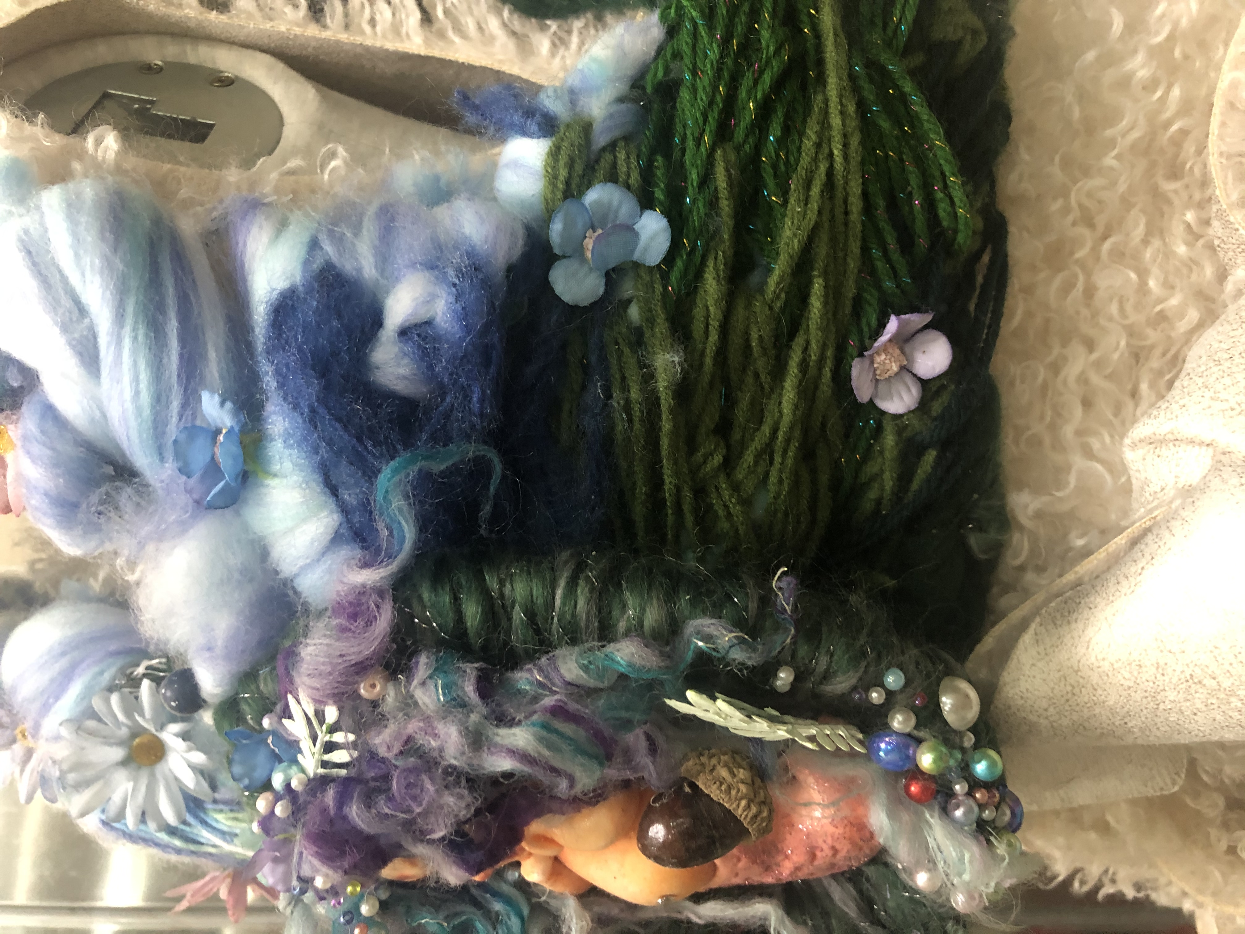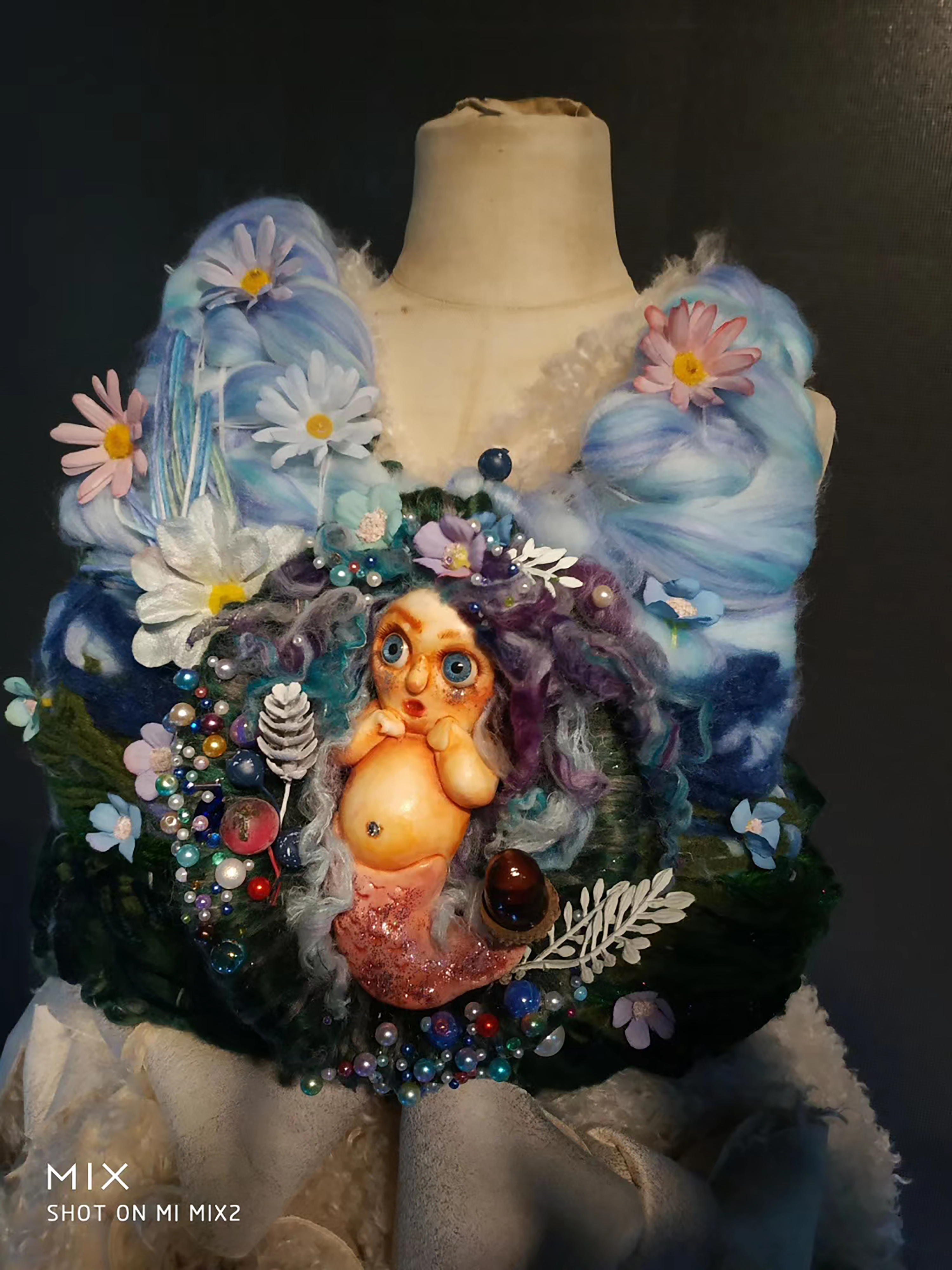 灵感来源于安徒生童话,将小时候睡前故事书最喜爱的卡通人物角色当作参考物开启的一部梦幻童话,本系列名为超龄儿童,服装主要表现在肌理上,主要使用3D打印笔制作框架,然后在框架上穿插毛线,选取与服装整体相匹配的毛线以及装饰物,制作出不同图案的肌理,形成独特的风格以及表现童趣。