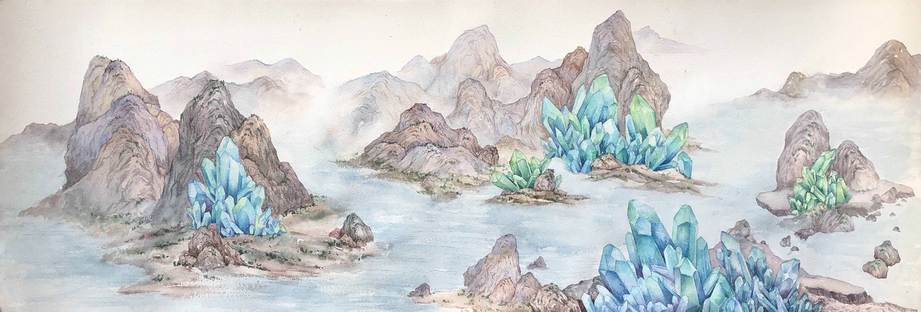 王希孟一幅《千里江山》绘出祖国的大好河山,在这个风水“宝”地里,人才辈出;而水晶,则是珠“宝”的一种,是自然界留给人类的珍贵财富。通过这两者之间的联系进行创作,碰撞出不一样的火花。