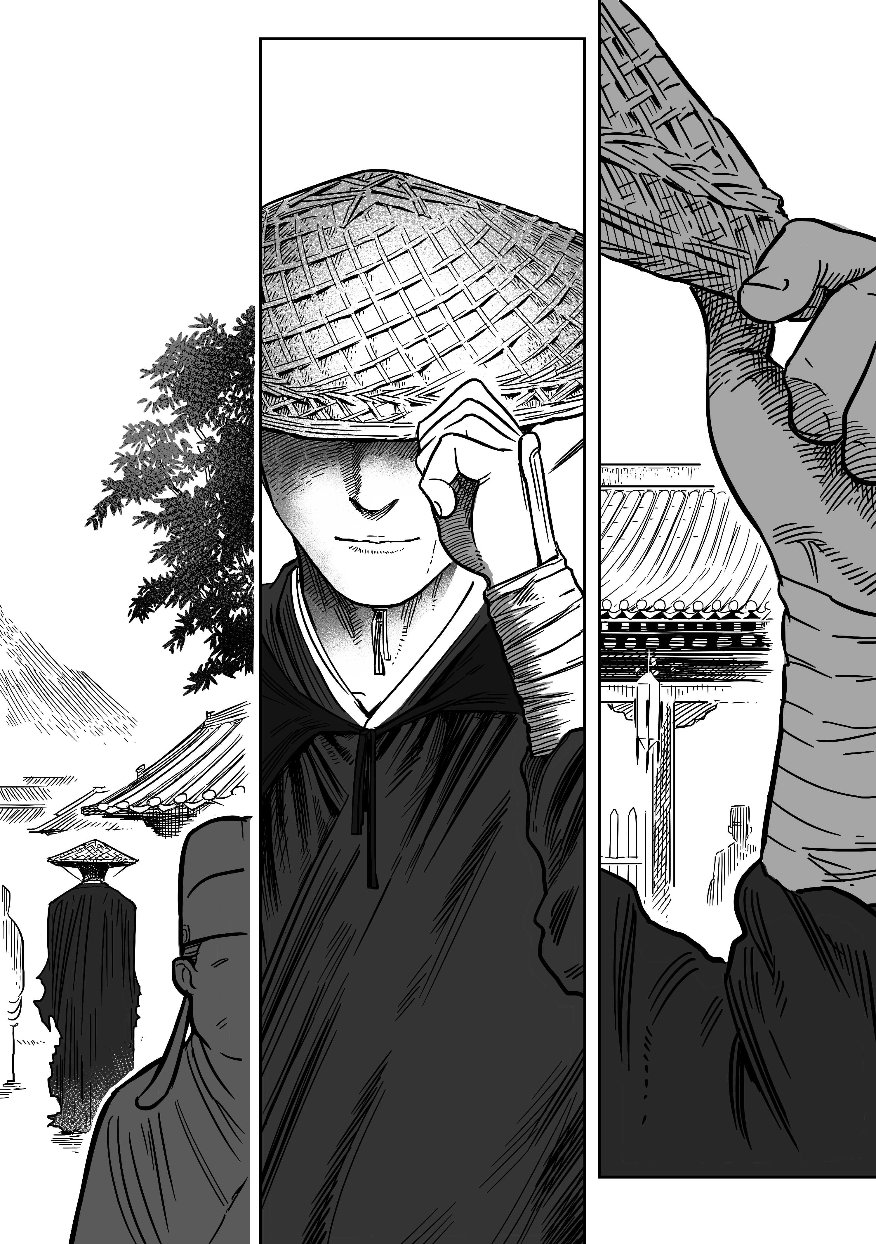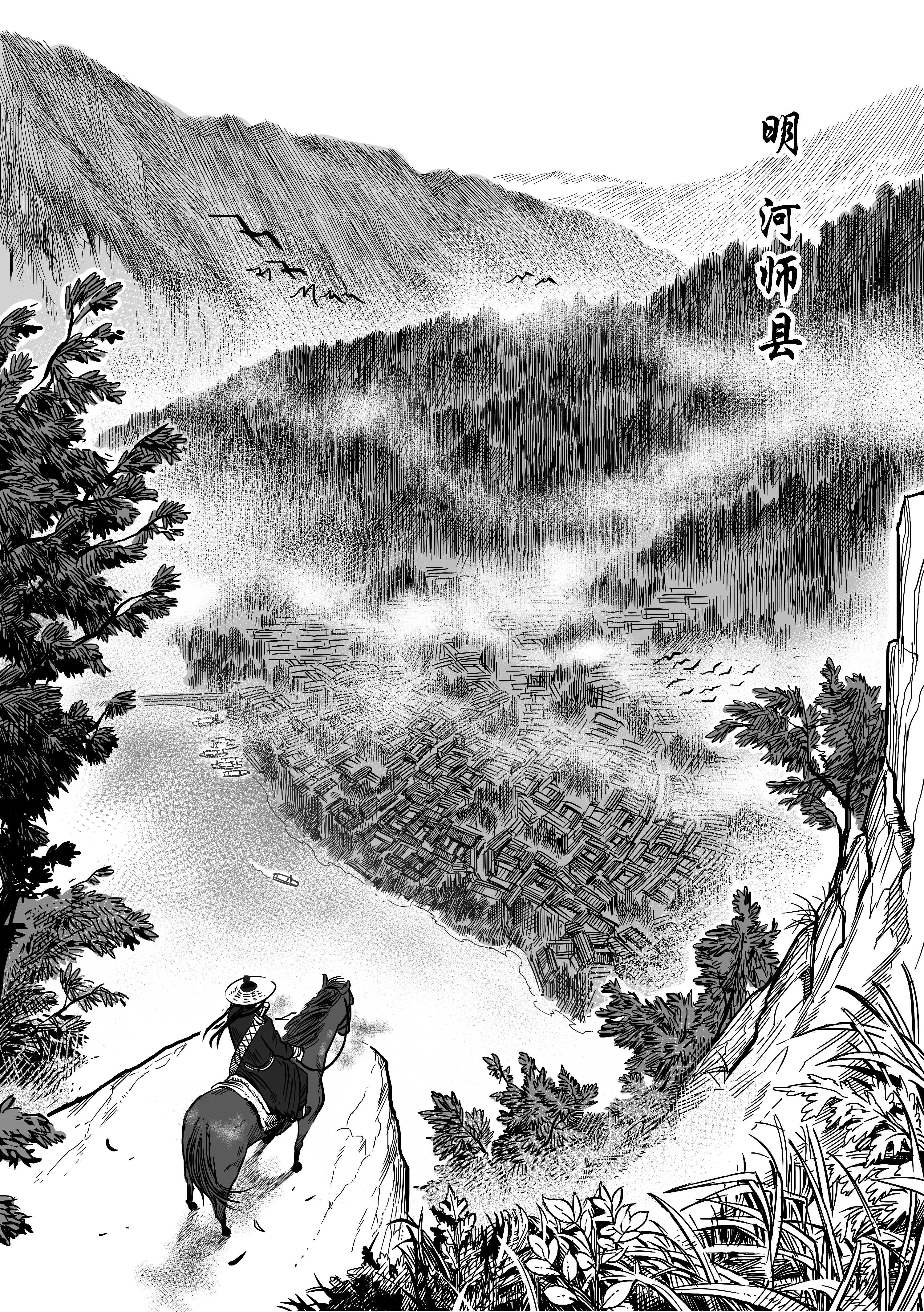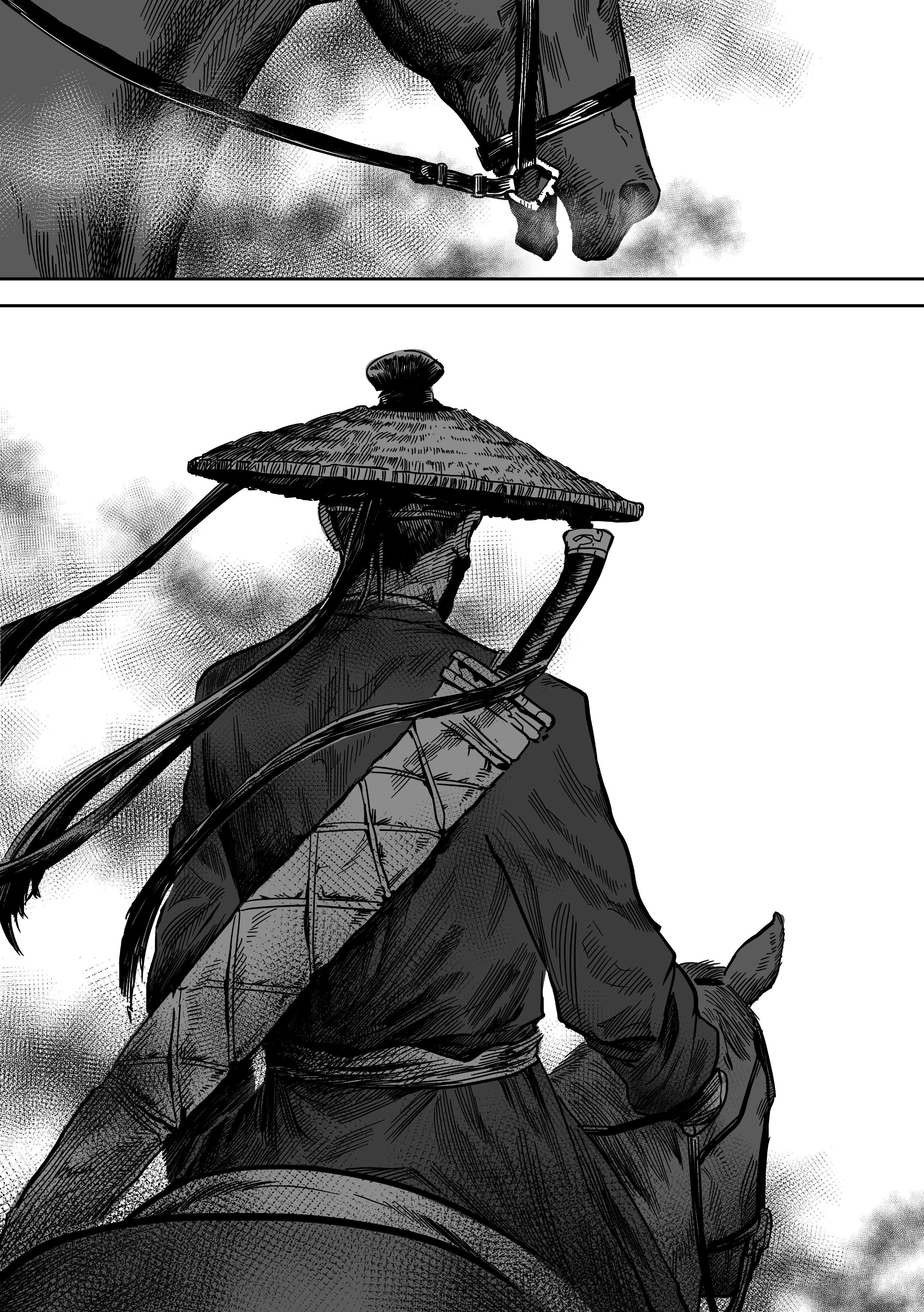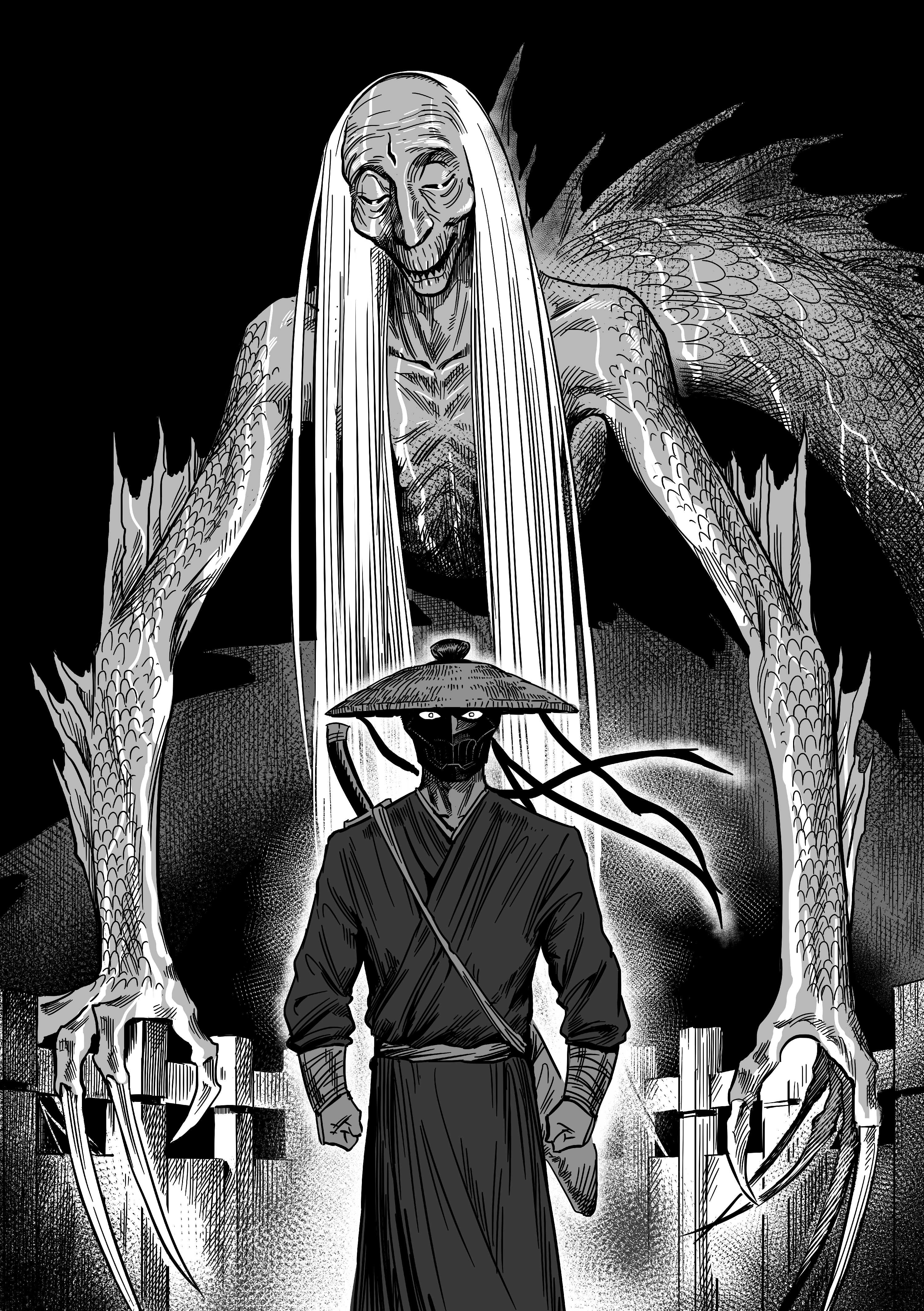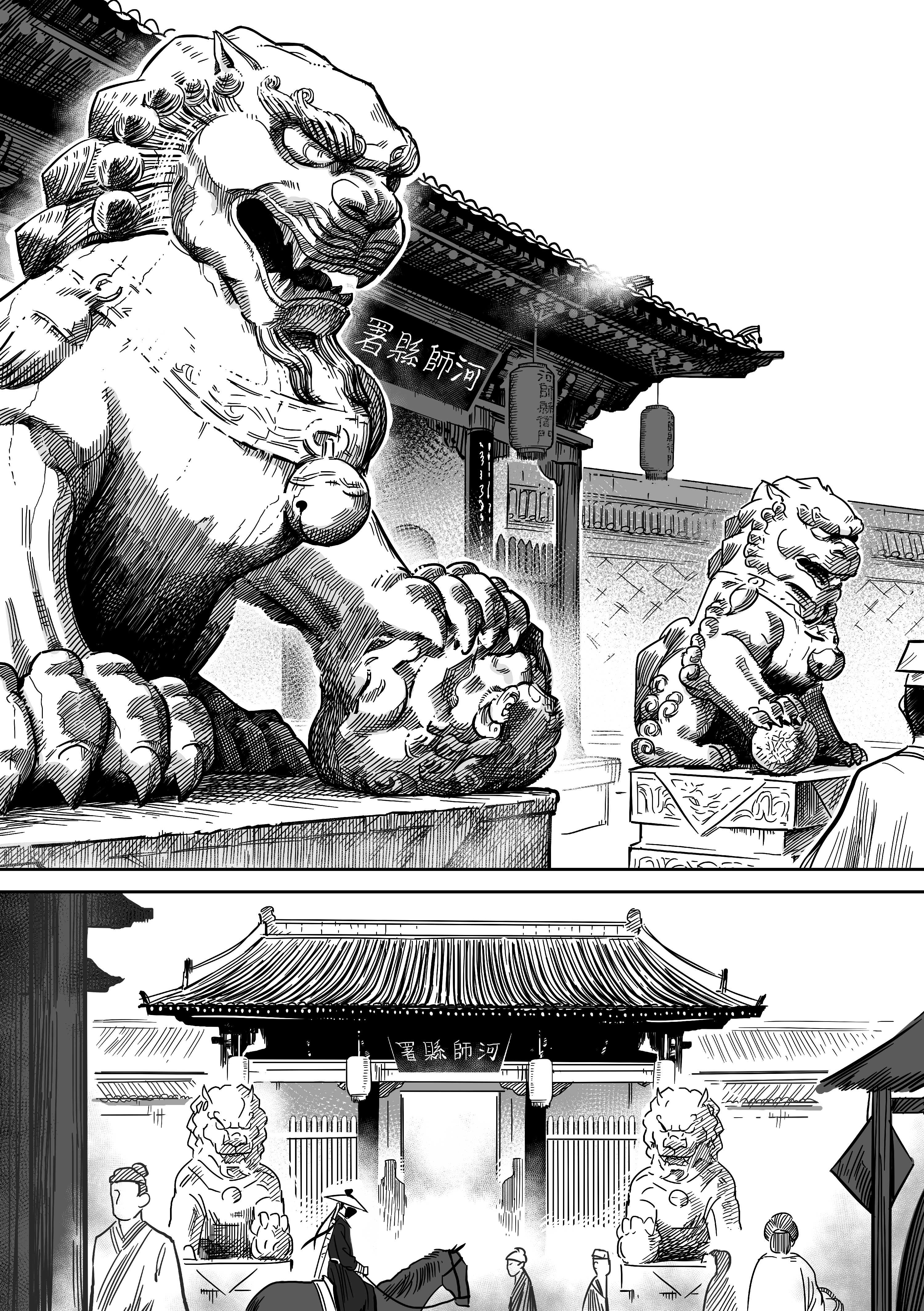 本人的毕业设计作品为短篇漫画《镇狮》,其主题是“刺客夜魁在人生道路上的执迷与转变”。故事讲述了刺客夜魁来到一座弥漫着镇座石狮传说的县城,接下了刺杀该地县官的买卖任务,但其过程让夜魁深埋心底的逝父记忆浮现,使他最终放弃了行刺。夜魁得知买卖任务的委托者是老河妖,以及老河妖与石狮仇怨的真相,执意拒绝行刺,结果被老河妖恼怒围杀。夜魁不敌后逃到了县衙门前。最终,在绝境下,显灵的石狮化解了河妖灾害,也救下了负伤的夜魁。