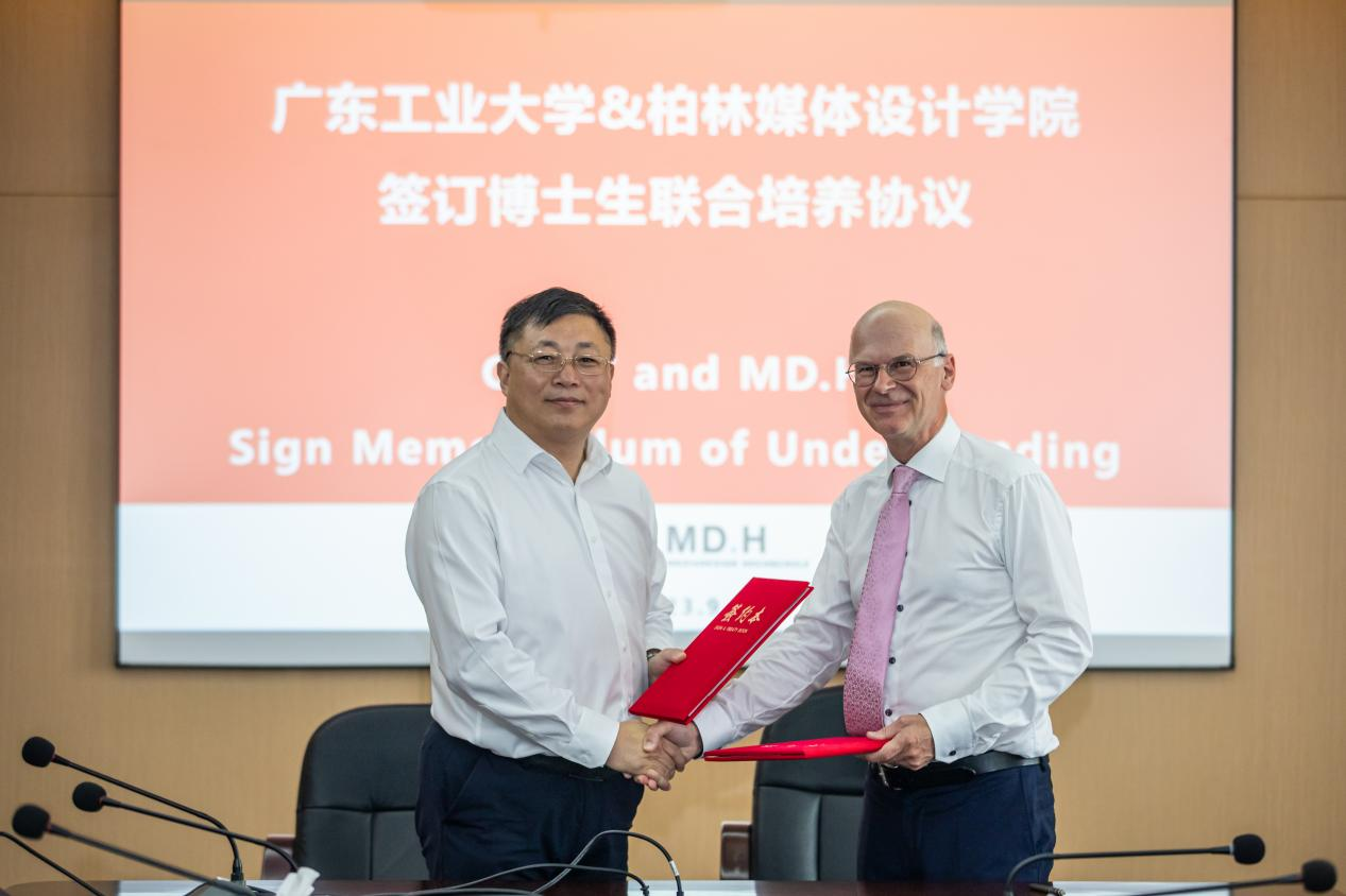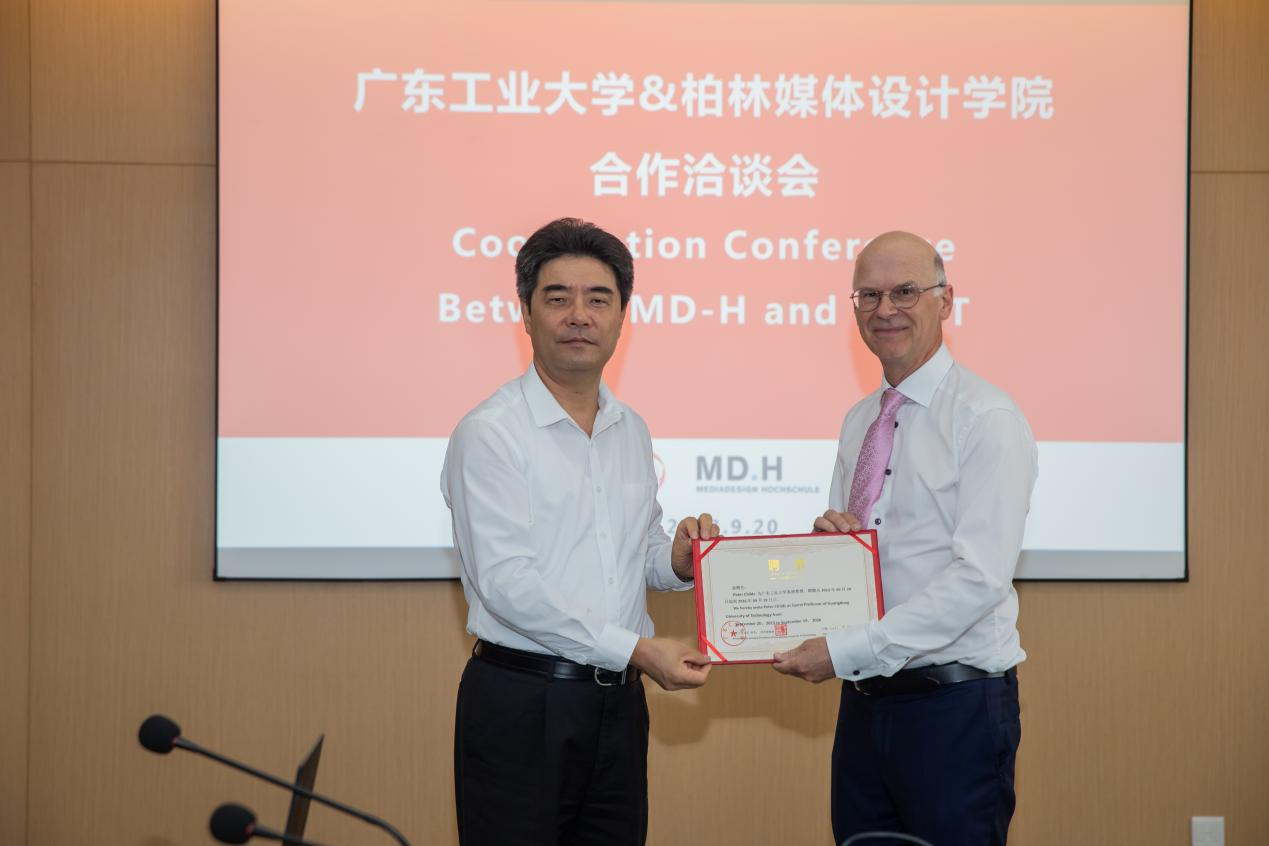 胡钦太书记与Peter Childs亲切会面后,向其颁发了广东工业大学客座教授证书,王成勇颁发了广东国际先进设计中心特聘教授聘书。Peter Childs院士与王成勇共同签订了柏林媒体设计90分钟足球网 与广东工业大学博士生联合培养备忘录,这标志着三方携手并进迈出了坚实一步和实质性发展。
